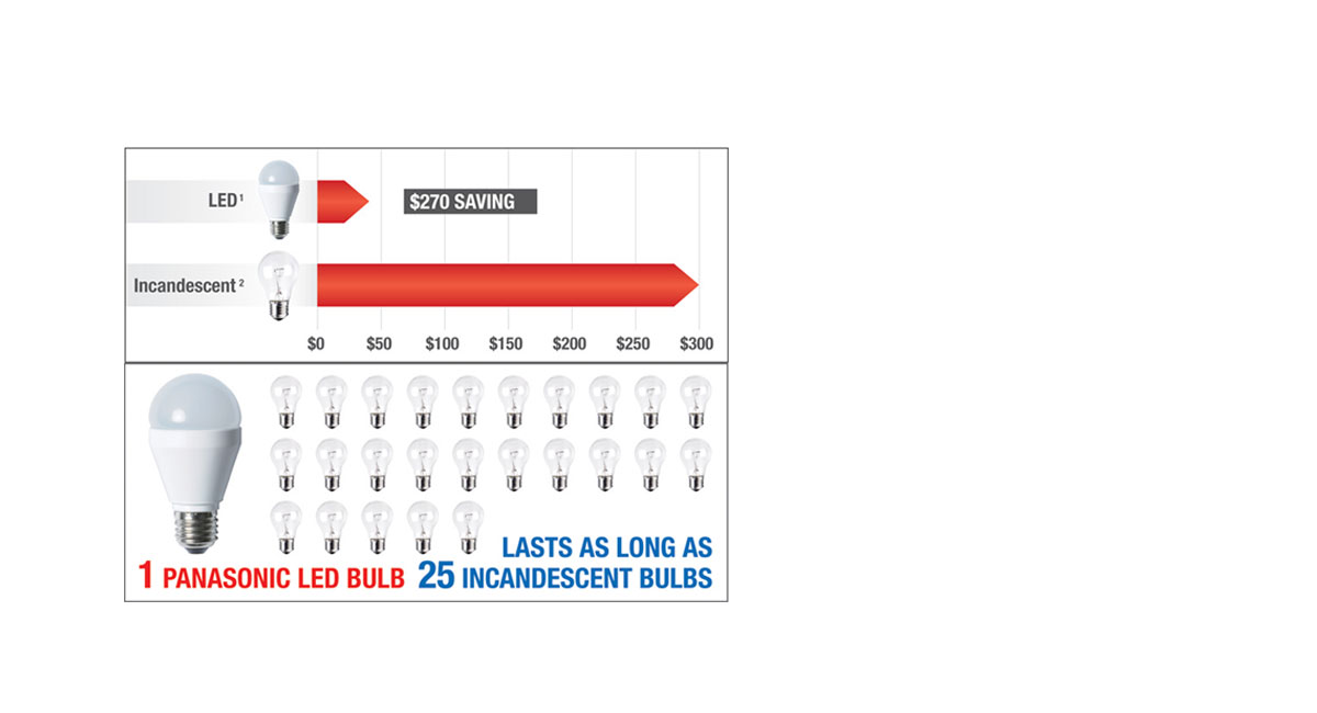 1: Based on Panasonic LED 8W bulb RRP $24.00 and rated life of 25,000 hours 2: Based on standard incandescent 60W bulb RRP $1.29 and average life of 1,000 hours