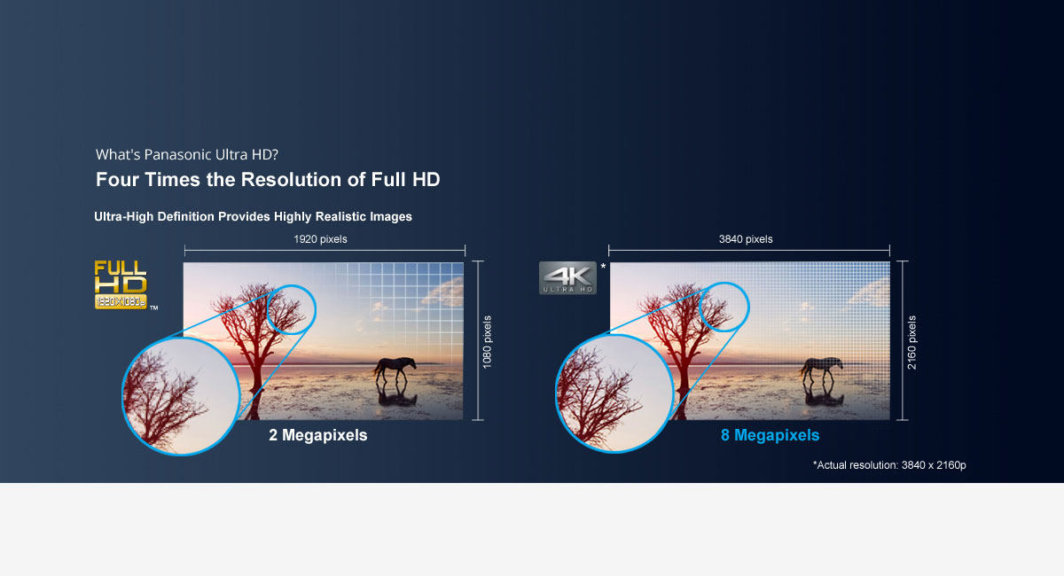 The next generation 4K Ultra HD VIERA TV surpasses even Full HD image quality. Its 4K Fine Remaster Engine™ brings 4K Ultra HD beauty to virtually all image sources and 4K 50 / 60p input enables single wire input of 50 / 60p Native 4K content.