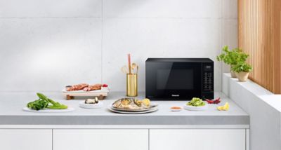 Mikrofalówka wielofunkcyjna NN-CT56 przekonuje grillem, gorącym powietrzem i różnymi programami automatycznymi. Dzięki niewielkiej głębokości nadaje się szczególnie do małych kuchni.