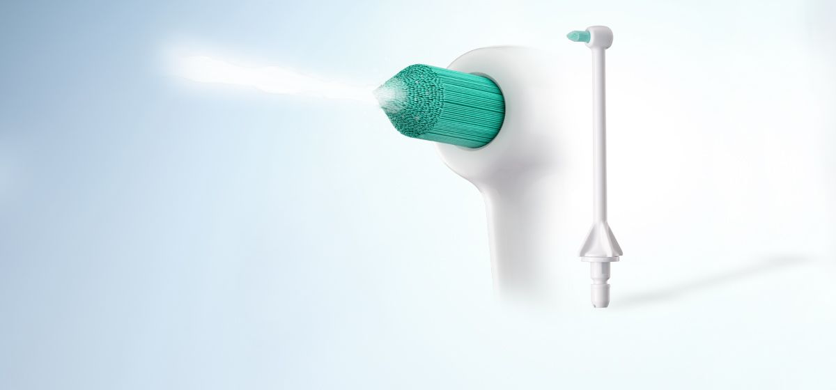 Duza ortodontică poate îndepărta placa și particulele de alimente de pe aparatul dentar prin combinația dintre un jet de apă optimizat și capul de perie integrat.