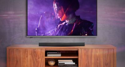 HTB100 је танка звучна конзола модерног изгледа дизајнирана тако да се уредно уклопи у простор испод телевизора. Унутар сјајног црног кућишта са металном мрежастом решетком налази се 45 вати моћног стерео звука који пружа импресиван звук и бас – како бисте могли да чујете све. Лако је повежите са телевизором путем HDMI кабла или повежите телефон путем Bluetooth® везе.