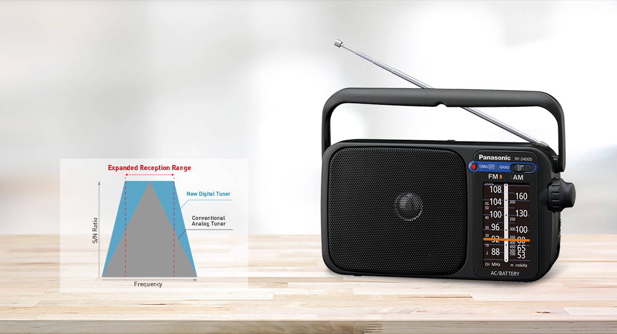 Den enkla och användarvänliga FM/AM-radion har en design som alla kan förstå och en ny digital tuner för enkel och exakt kanalsökning. Den fungerar med strömkabel eller batteri så du kan ha den inkopplad inomhus men även ta med den utomhus om du vill.