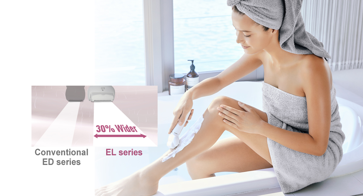 Panasonics wet/dry-epilator har en helt ny formgivning med ett epileringshuvud som är 30% bredare* och 60 pincetter för en snabbare och mer effektiv hårborttagning. Det nya huvudet kan vridas 90° för att kunna följa kroppens former och ge en extremt mjuk hudfinish.