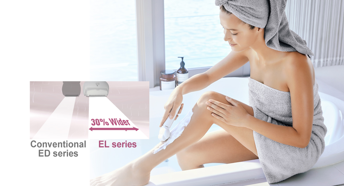 Panasonics wet/dry-epilator har en helt ny formgivning med ett epileringshuvud som är 30% bredare* och 60 pincetter för en snabbare och mer effektiv hårborttagning. Det nya huvudet kan vridas 90° för att kunna följa kroppens former och ge en extremt mjuk hudfinish.