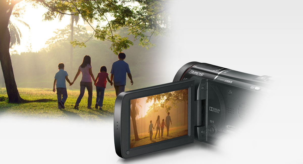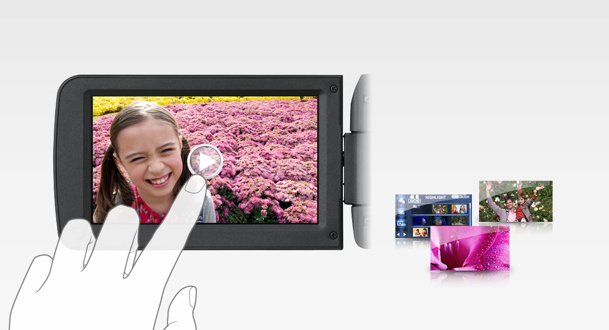 X920M är utrustad med en 3,5-tums LCD-skärm med 1152K-punkters upplösning och intuitiv touch-styrning. Du kan använda Touch Shutter-funktionen för att ta stillbilder med fingertoppen mot skärmen, samtidigt som du filmar. För att titta på bilderna kan du bläddra fram sidor med miniatyrbilder genom att föra fingret över skärmytan. Du får en enkel och intuitiv kontroll utan att behöva släppa LCD-skärmen med ögonen.