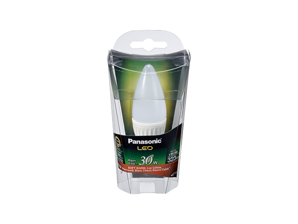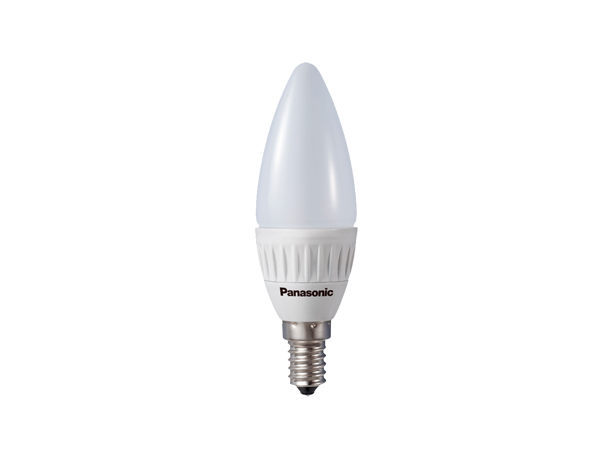LED-kronljuslampa med E14-sockel, full effekt direkt, lång livslängd på 15 000 timmar (10 år vid 2,7 timmars användning per dag), inget kvicksilver, 100 000 tändcykler och 2 års Panasonic-garanti.