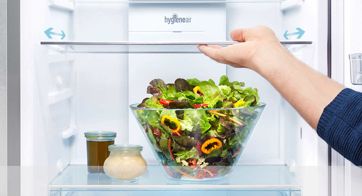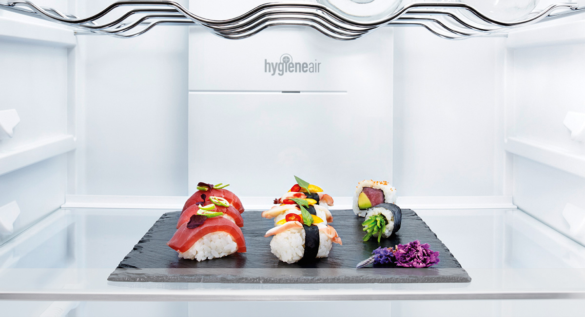 HygieneAir är en teknik som motverkar bakterier och finns integrerad i kylskåpets luftsystem med en desinfekteringseffekt på hela 99,9 %.