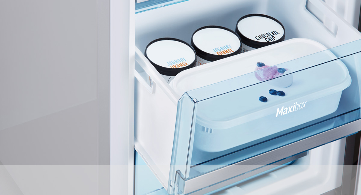 De flyttbara Slide'n'Store-hyllorna i härdat glas gör det enklare att anpassa utrymmet inuti ditt kylskåp.