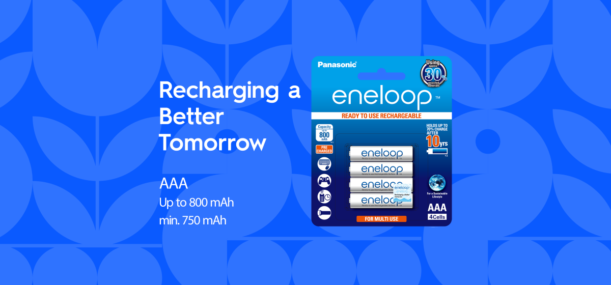 eneloop is made with recycled materials to support resource circulation, delivering the same high performance while reducing environmental impact