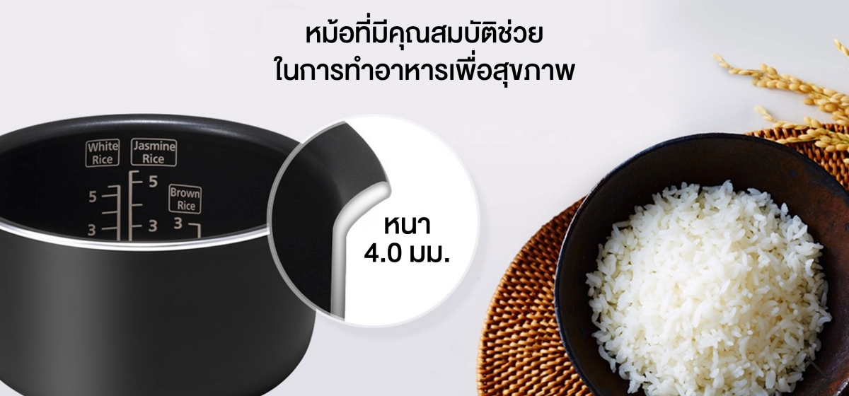 หม้อชั้นในหนาพิเศษ 4.0 มม. กักเก็บพลังงานความร้อนไว้ภายในหม้ออย่างมีประสิทธิภาพจึงส่งความร้อนไปยังข้าวทุกเม็ดอย่างทั่วถึงและทําให้ข้าวหุงสุกใหม่ๆ มีความนุ่มมากขึ้น