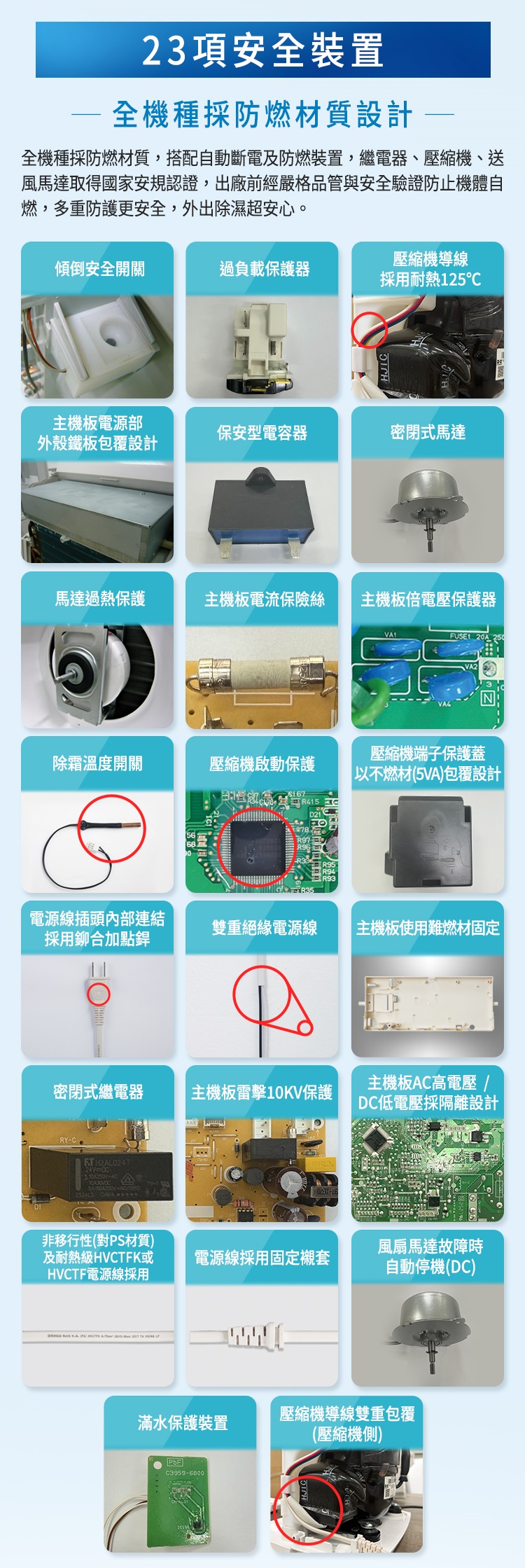 全機種採防燃材質,搭配自動斷電及防燃裝置,繼電器、壓縮機、送風馬達取得國家安規認證,出廠前經嚴格品管與安全驗證防止機體自燃,多重防護更安全,外出除濕超安心。