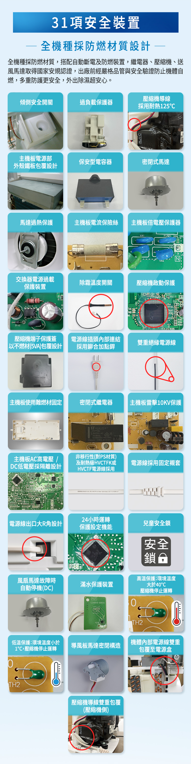 全機種採防燃材質,搭配自動斷電及防燃裝置,繼電器、壓縮機、送風馬達取得國家安規認證,出廠前經嚴格品管與安全驗證防止機體自燃,多重防護更安全,外出除濕超安心。
