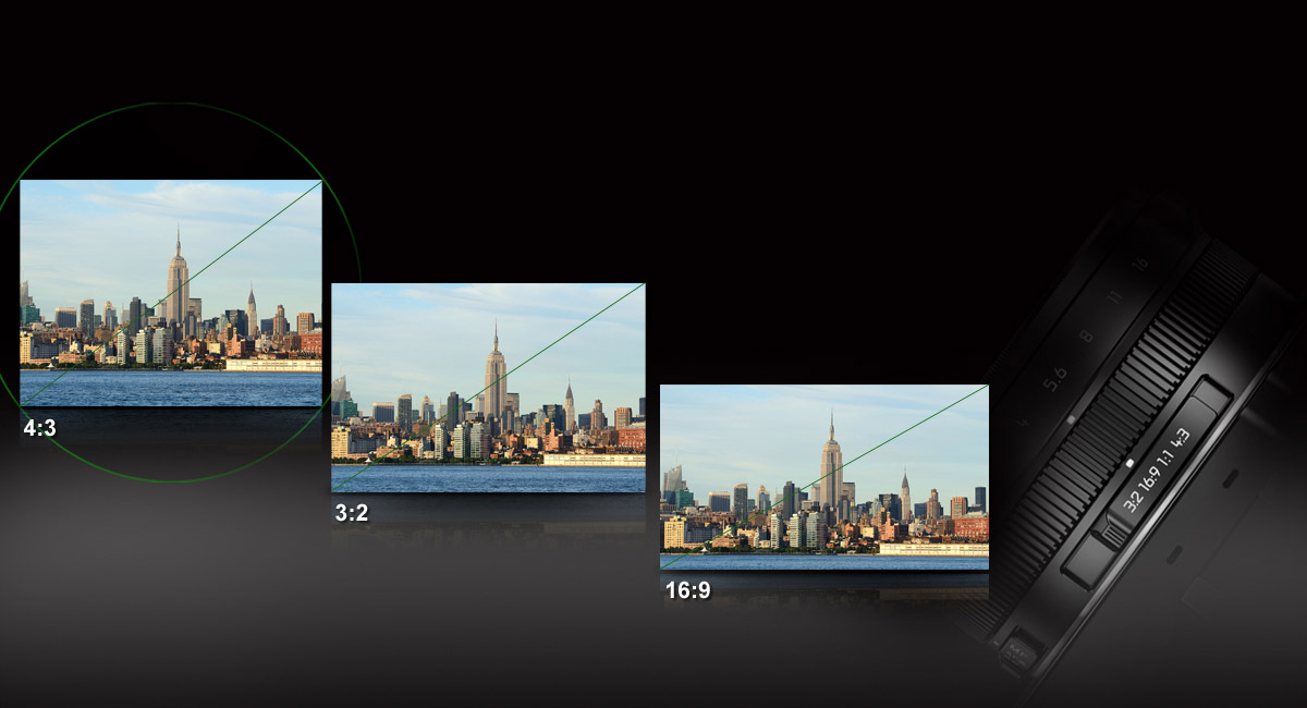DMC-LX100 採用了多個長寬比的錄影規格。LUMIX 的多長寬比功能是名符其實的「多長寬比」,因為可讓您以相同的視角錄下長寬比為 4:3、3:2 或 16:9 的影像。可使用鏡身切換開關來快速調整長寬比設定。