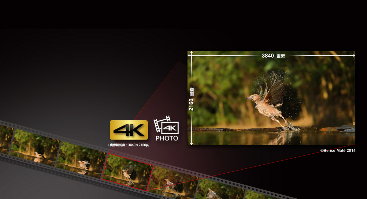 從 4K 影片擷取高解析度相片 享受真正貼近生活的高解析度 4K 錄影*。迎來了一種創作 4K 相片的新形式,以相當於 3840 x 2160 的 800 萬畫素解析度,剪輯 4K 影片中的神奇時刻。一旦進入 4K 相片模式,就會將亮度設定調整成適合相片的 0-255。除了 16:9,也可以用長寬比按鈕選擇 4:3 或 3:2。 * 最高可錄製長達 15 分鐘的 4K 影片。 錄製 4K 影片時,請使用等級為 UHS Speed Class 3 的卡。