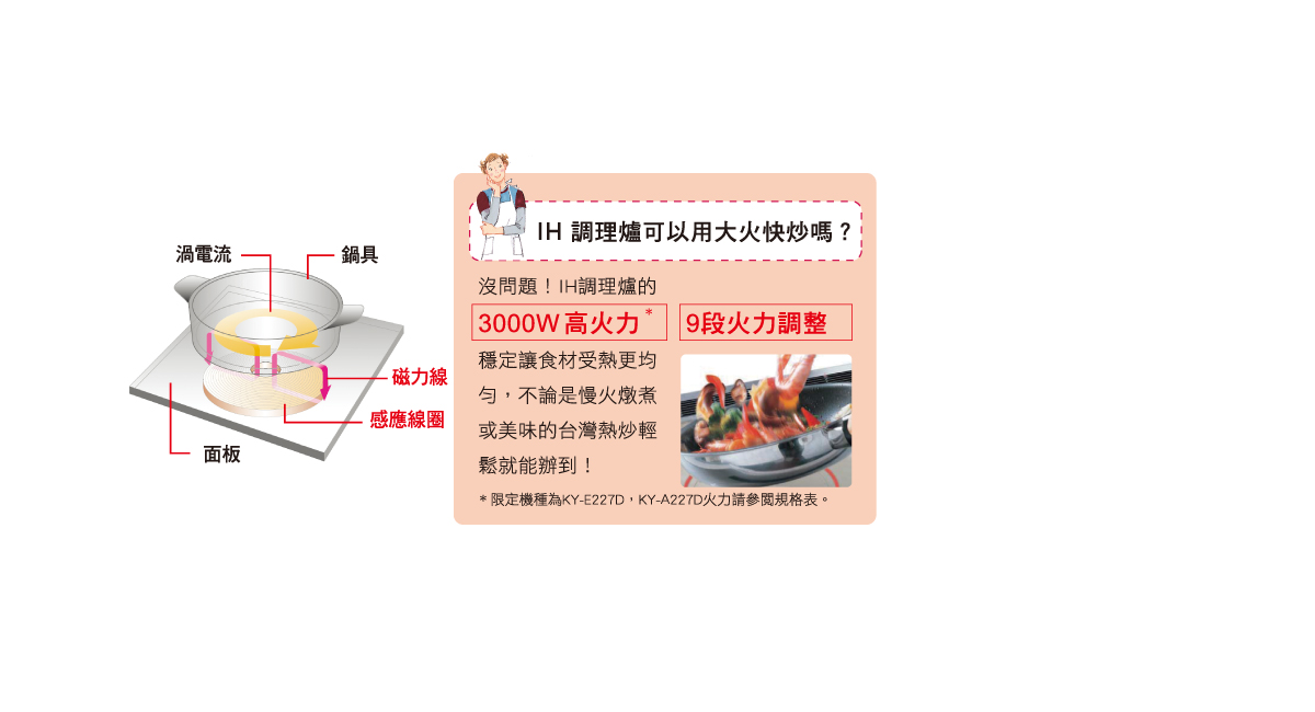爐面與鍋具緊密貼合,3000W大火力直接傳熱,*²烹熟料理快速更省能