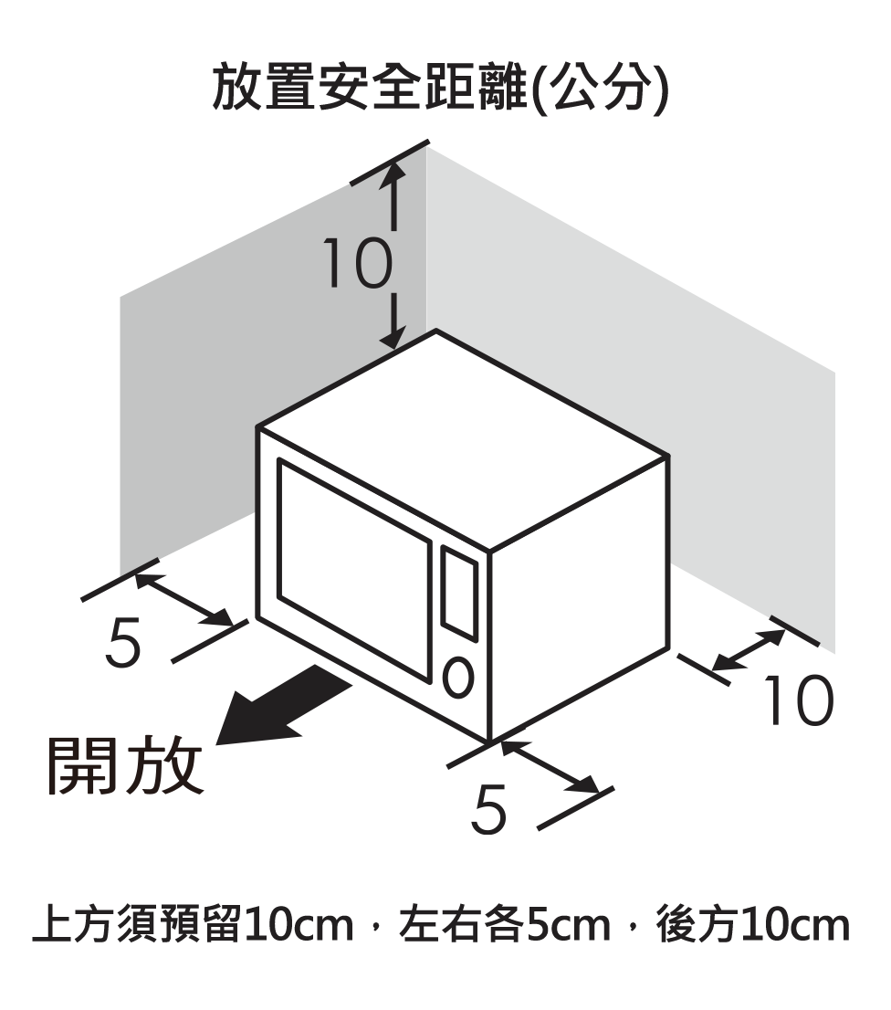 *21:放置微波爐的預留空間分別為:上方和後方各10cm;左方和右方各5cm。
