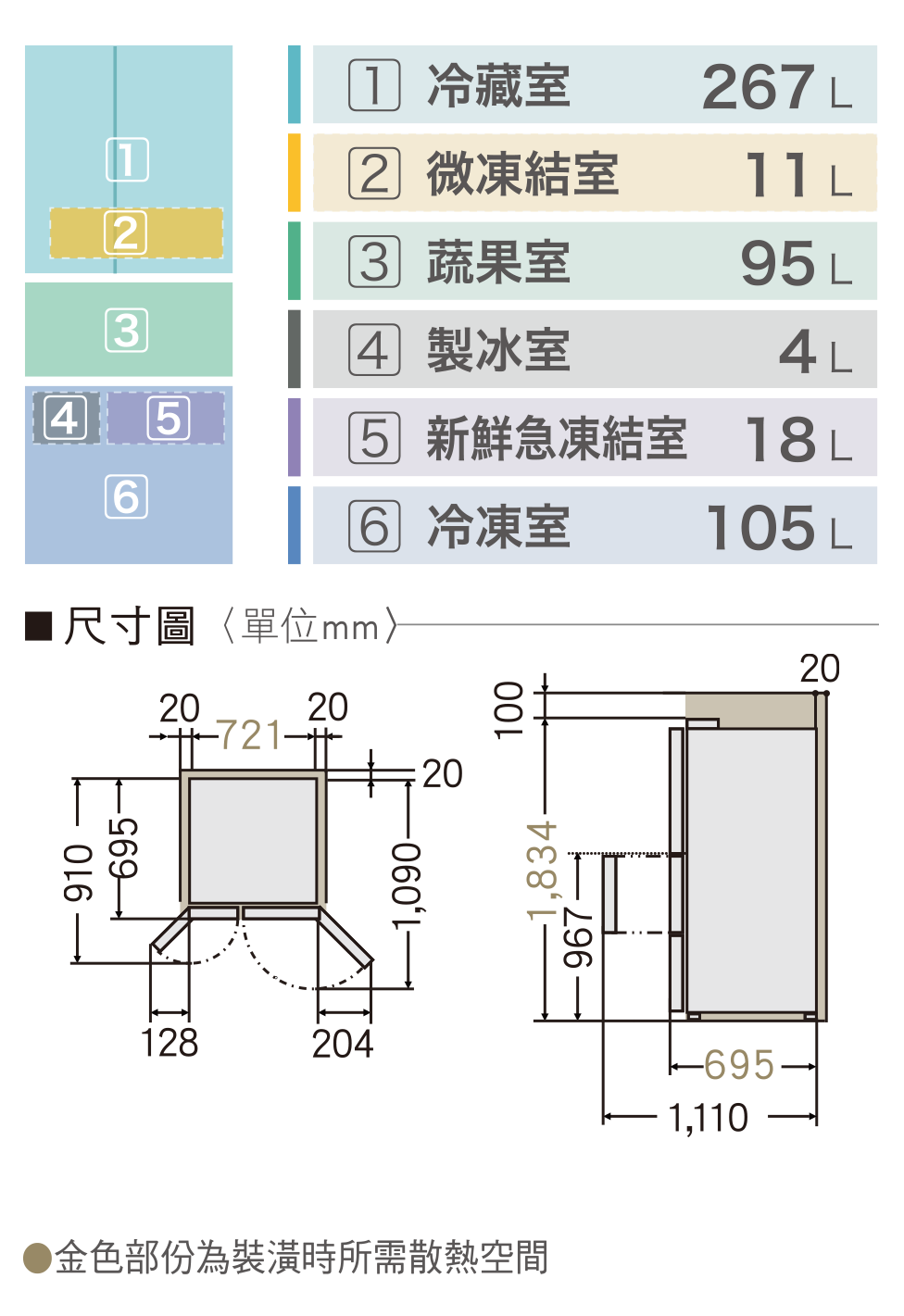 *8 此構造式樣為日本機種(以NR-F601WX示意),國產機種與進口品略有不同,但機能效果是相同;內裝速冷金屬盤樣式、數量略有不同,詳情請依實物為主,依據財團法人食品工業發展研究所相關報告,根據實驗可知放在-3°C微凍結室,7日後依然新鮮。保鮮效果因運轉狀況、食材種類、狀況與數量可能有所差異。