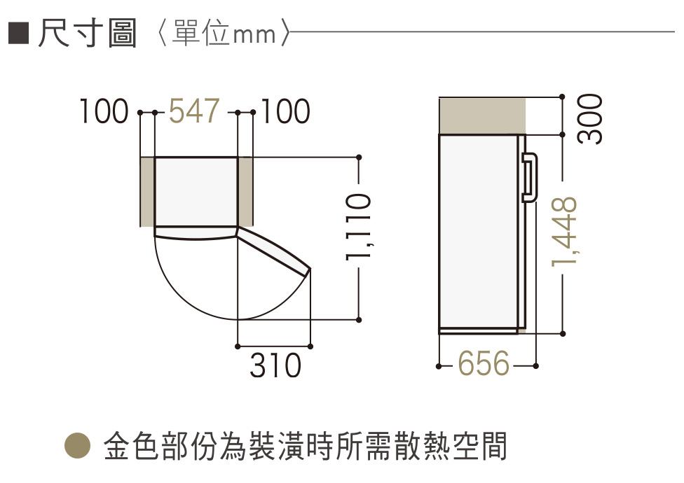 *冷凍/冷藏櫃頂面請勿放置物品並距離天花板30cm以上,左右兩側留10cm以上空間,可使散熱情況更佳。