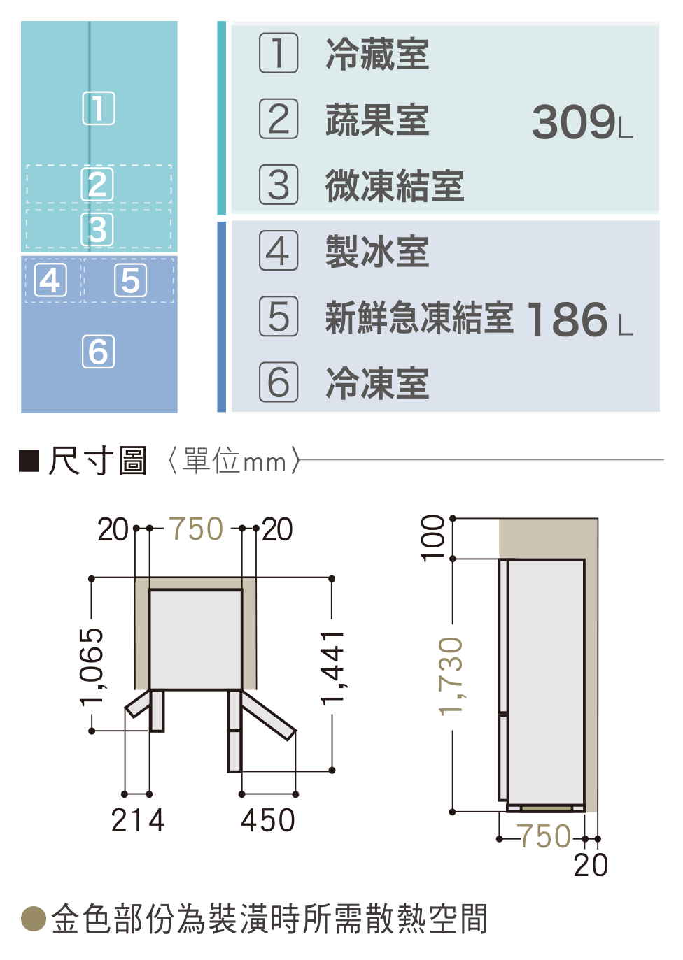 *1 使用新鮮急凍結時,將增加約20%電力消耗量。環境溫度20°C、無開關冰箱門(本公司測定)。此外,電力消耗量會因使用條件而異。
