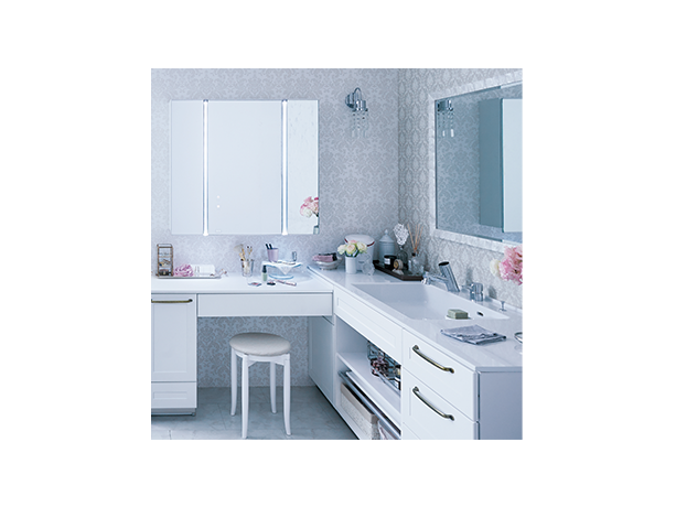 在寬敞的檯面上輕鬆化妝。實用又時尚的L型乾、濕區設計,清潔美妝更輕鬆自在。