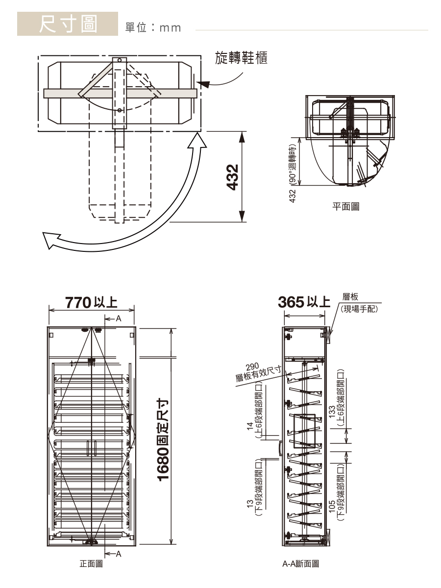 ※ 本公司僅銷售「旋轉鞋架五金」,關於櫃體的承重強度,需請考量含收納鞋子與五金的整體重量