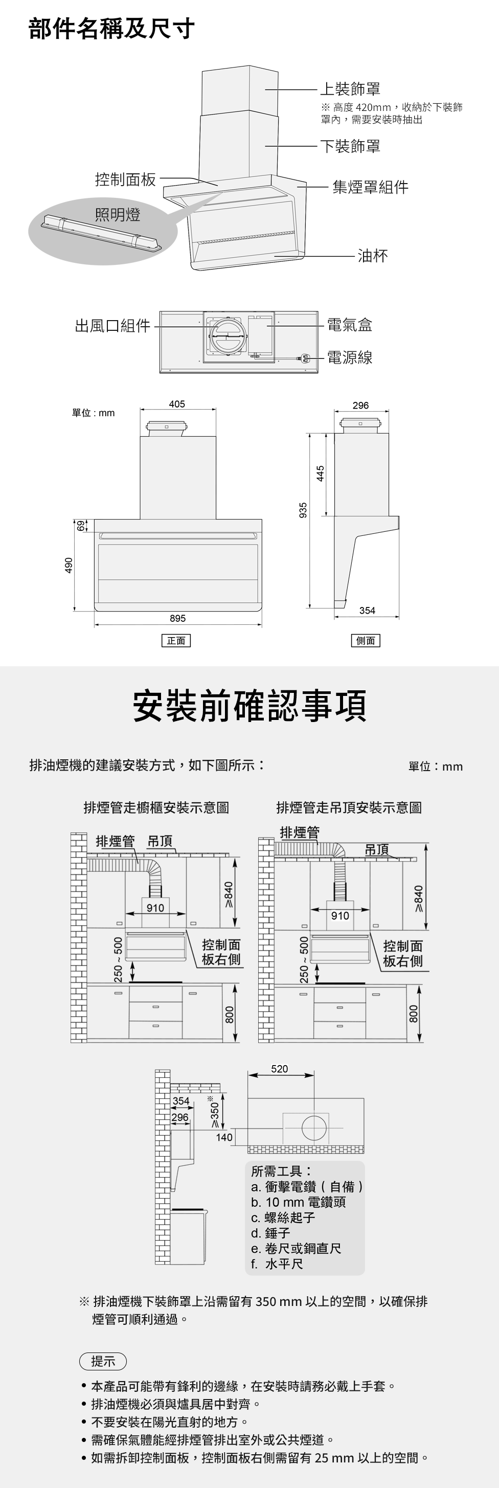 ● 橫向895mm+側向354mm近吸結構,有效增加攏吸範圍,全面防止油煙從兩側竄逃。