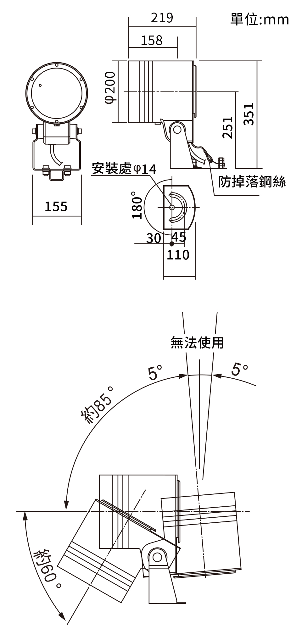 附上防止掉落的鋼絲,萬一不愼掉落時也可以有所防備。燈具溫度在60度以下,若不慎觸碰到時也可以安心使用。