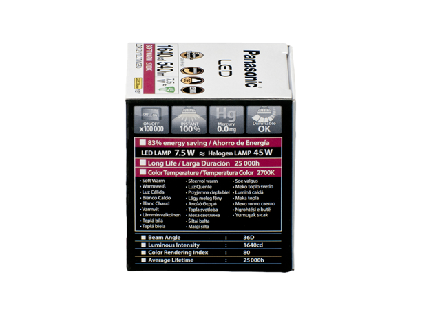 Compact Design, Instant light 100%, extra long lifetime 25,000hrs (25 years at usage of 2.7 hours per day), No mercury, frequent switching cycles 100,000 times, 2 year Panasonic Warranty
