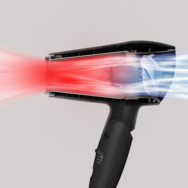 Nhờ sự kết hợp cân bằng giữa luồng khí mạnh mẽ và phân phối nhiệt nên máy sấy 2000W này hoạt động hiệu quả tương đương với máy sấy 2300W*.